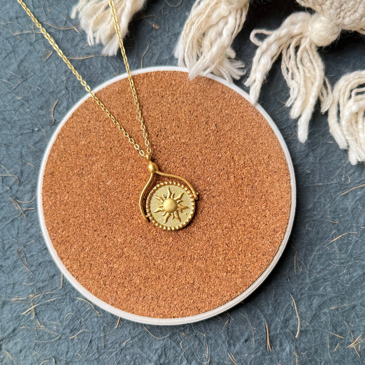 Enhance your outfit's celestial allure by wearing the sun side of the locket during the day, and flipping to the moon side for evening elegance. Let this dual-sided piece accentuate your unique style from dawn to dusk.